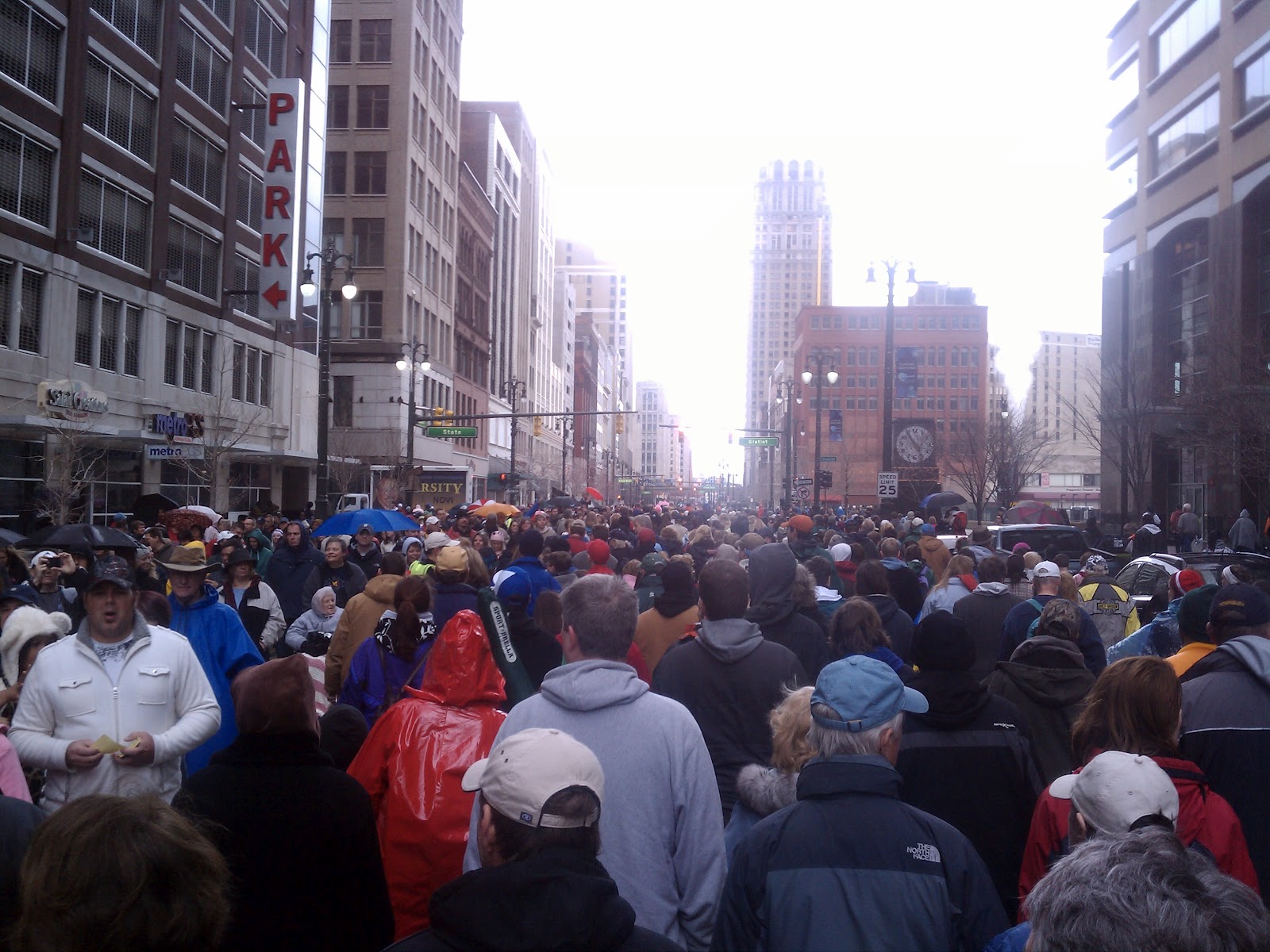 In fact, one of the men who made that prediction was local TV weatherman Chuck Gaidica. As the event started, the rain stopped, and Chuck said in a beaming voice, (paraphrased here) “My colleagues and I predicted rain here in Detroit all morning. The sudden dryness at that very moment in this very place could only be credited to God.” The crowd cheered in agreement. It seemed to be a thought most of us had had prior to Chuck saying so...
